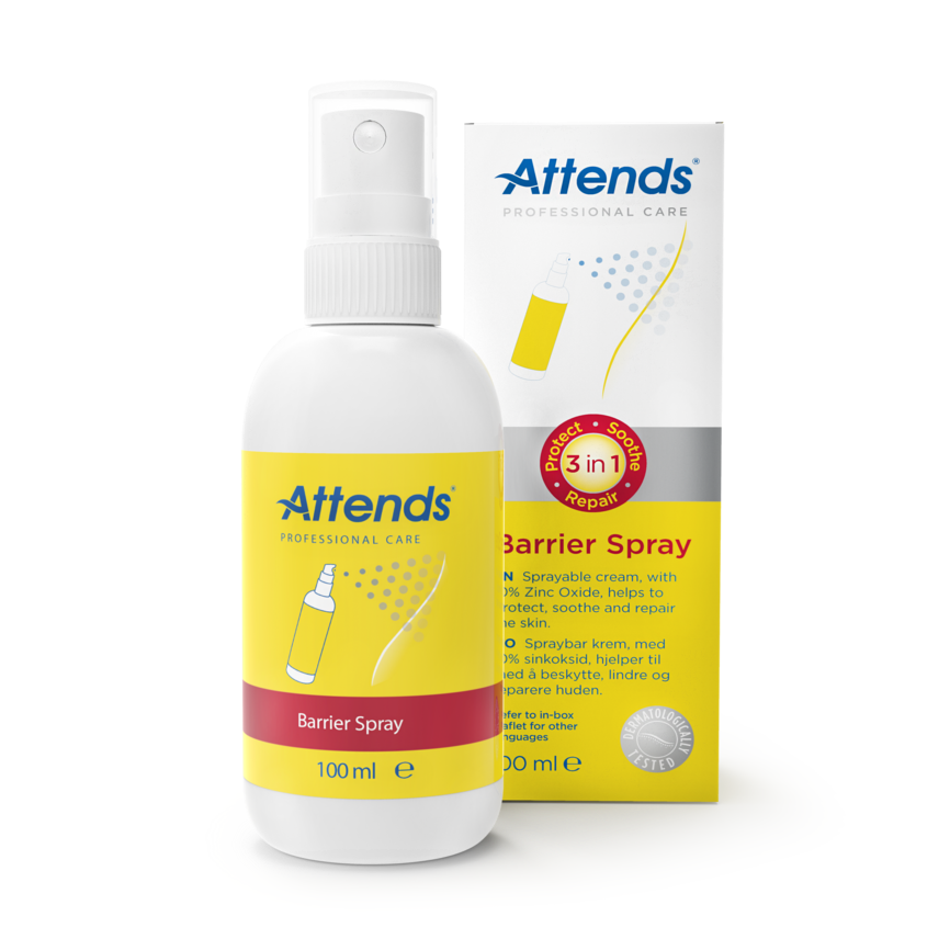 Attends Barrier Spray 100 ml er en skånsom og effektiv hudbeskyttelse utviklet for personer med sensitiv hud eller inkontinensrelatert irritasjon. Sprayen legger en tynn, transparent barrierefilm som beskytter huden mot fukt, friksjon og ytre påvirkninger, uten å tette porene.