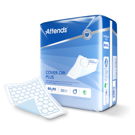 Attends Cover-Dri 80x90 cm er et stort, superabsorberende engangsunderlag som gir trygg og effektiv beskyttelse av seng, stol og andre overflater. Underlaget er utviklet for bruk ved inkontinens, stell, sårbehandling og situasjoner der ekstra hygiene og væskesikring er nødvendig.