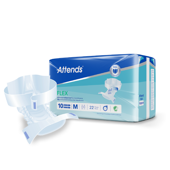 Attends Flex 10 M beltebleier er utviklet for voksne med tung urinlekkasje som trenger maksimal beskyttelse kombinert med høy komfort. Bleien har et justerbart beltesystem som gjør den enkel å ta på og sikrer optimal tilpasning til kroppen.