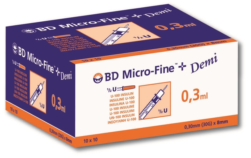 BD Micro-Fine insulinsprøyte 0,3ml x 8mm (30G) U-100 Gravert doseringsmerke for sikker dosering. Insulinsprøyte med fast kanyle gir økt sikkerhet og mindre avfall. Lateksfri pakning eliminerer risikoen for allergiske reaksjoner. CE godkjent iht. MDD 93/42/EEC klasse IIa.
