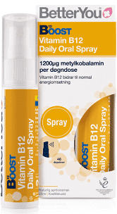 Better You Boost Vitamin B12 Spray inneholder en spesialformula som gir tilskudd av vitamin B12 og krom direkte i munnen. De små dråpene absorberes raskt og tas opp hurtig. Sprayform er et praktisk alternativ til tabletter og kapsler. Vitamin B12 bidrar til normal energiomsetning og dannelse av røde blodlegemer. Vitamin B12 bidrar til nervesystemets normale funksjon, psykologisk funksjon og reduksjon av tretthet og utmattelse. Vitamin B12 bidrar til immunsystemets normale funksjon
