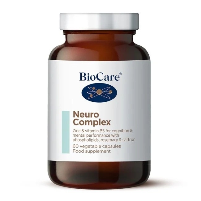 Neuro Complex fra BioCare er en unik kombinasjon av salvie, rosmarin, safran, alfaliponsyre, karnitin, fosfatidylserin, sink og vitamin B5. Sink bidrar til normal kognitiv funksjon. Sharp-PS® er lecitin fra solsikke og tilfører fosfatidylserin. Kolin bidrar til normal lipidomsetning og leverfunksjon. Pantotensyre/B5 bidrar til normal psykologisk funksjon. Produktet har høy dose pantotensyre. Redusert dose og eventuelt pauser, vurderes derfor individuelt.