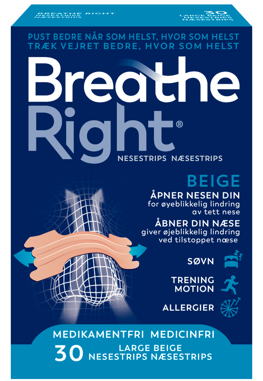 Breathe Right nesestrips letter tett nese ved f.eks forkjølelse og allergi, og kan redusere eller eliminere snorking. Bøylen som er inni stripsen løfter forsiktig neseveggene ut slik at passasjen åpnes og forbedrer luftgjennomstrømningen.