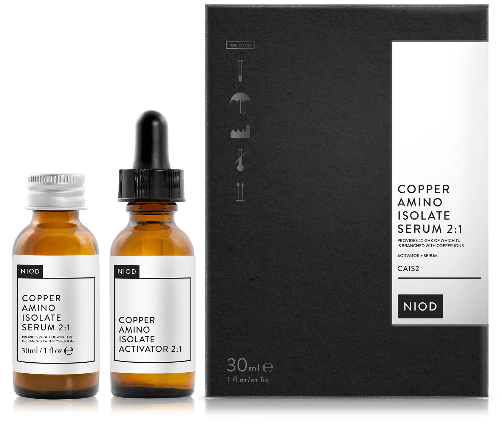 Serum med 2% av kobberpeptidene GHK och GHK-Cu som stimulerer reparasjon og dannelse av kollagen.