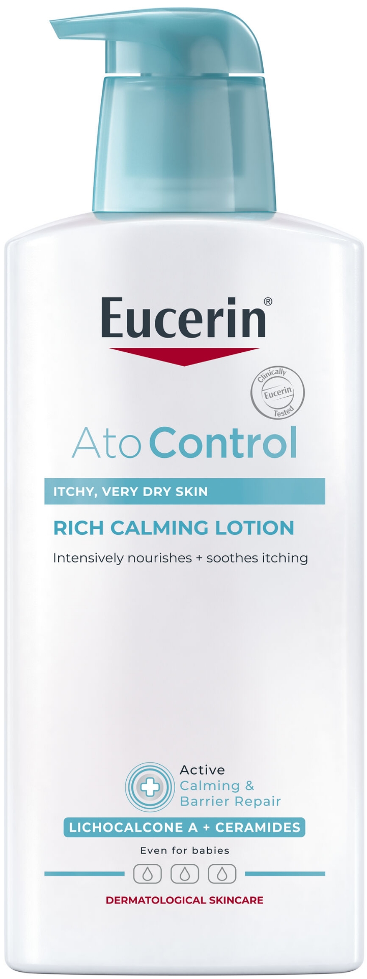 Eucerin AtoControl Rich Calming Lotion 400 ml er en nærende og beroligende kroppslotion utviklet for atopisk, sensitiv og svært tørr hud. Den rike formelen kombinerer Licochalcone A – kjent for sine betennelsesdempende og beroligende egenskaper – med ceramider og naturlige oljer som styrker hudens barriere og reduserer fuktighetstap.