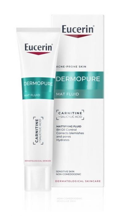 Eucerin DermoPure Mat Fluid 40 ml er utviklet for deg med fet, uren eller akneutsatt hud som ønsker en lett, men effektiv fuktighetskrem som kontrollerer glans gjennom hele dagen. Den avanserte formelen inneholder salicylsyre, som bidrar til å redusere urenheter og forebygge nye utbrudd, samt Licochalcone A, som roer irritasjon og rødhet.