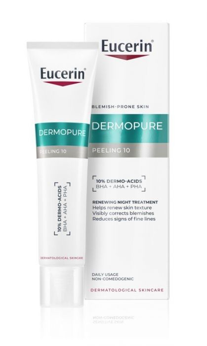 Eucerin DermoPure Peeling 10 40 ml er en avansert eksfolierende behandling utviklet for fet, uren og akneutsatt hud. Formelen kombinerer 10 % hydroksisyrekompleks (AHA/BHA), inkludert salisylsyre, som jobber aktivt for å løse opp tilstopninger, redusere kviser og forbedre hudens tekstur.