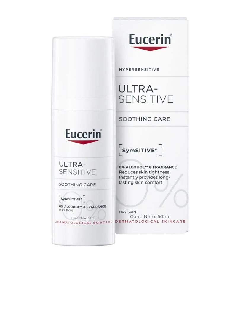 Eucerin UltraSensitive Soothing Care for tørr hud er en beroligende og fuktighetsgivende ansiktskrem utviklet spesielt for hypersensitiv og reaktiv hud. Formelen inneholder det innovative SymSitive®, et aktivt stoff som virker direkte på hudens følsomhetsreseptorer for å redusere ubehag som svie, stramhet, rødhet og irritasjon.