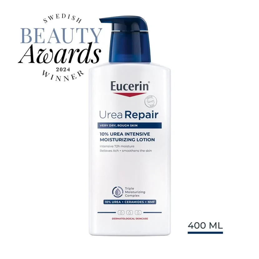 Eucerin UreaRepair 10% Urea Intensive Moisturising Lotion er en svært effektiv og intensivt fuktighetsgivende kroppslotion utviklet for tørr, svært tørr, ru og flassende hud. Formelen kombinerer 10% urea, ceramider og NMF (Natural Moisturizing Factors) som sammen binder fukt, styrker hudbarrieren og reduserer ruhet og stramhet.