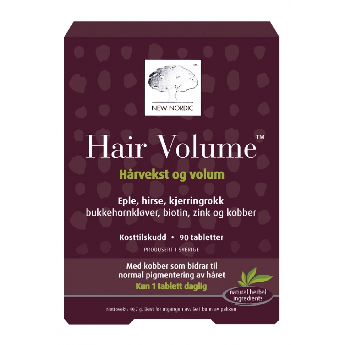 I Hair Volume tablettene finnes det en god kombinasjon av hårvekstfaktorer som gir næring og aktiverer nødvendige prosesser i hårsekkenes celler. Tablettene inneholder eple, hirse, kjerringrokk, bukkehornkløver, biotin, zink og kobber. Kobber bidrar til en normal pigmentering av håret. Biotin og zink bidrar til å vedlikeholde et normalt hår.