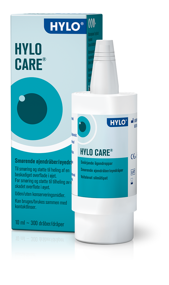 HYLO CARE inneholder dexpantenol (B-vitamin) og høykvalitets hyaluronsyre. Kombinasjonen imøtekommer øyets behov for intensiv gjenoppbygging. Dexpantenol støtter dessuten sårhelingen, noe som gjør at både overfladiske erosjoner på øyets overflate som forårsakes av en dårlig tårefilm, og sår, som iblant er et resultat av kirurgiske inngrep, kan heles raskere. Hyaluronsyren har unike egenskaper som gjør det mulig å danne en jevn og langtidsvirkende fuktighetsfilm.