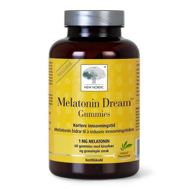 | Ingredienser: Glukosesirup, sukker, geleringsmiddel (pektin), syre (sitronsyre), surhetsregulerende middel (natriumsitrat), naturlig aroma (kirsebær, granateple), solsikkefrøolje, konsentrat av svart gulrotjuice, kokosnøttolje, melatonin, overflatebehandlingsmiddel (karnaubavoks). |
