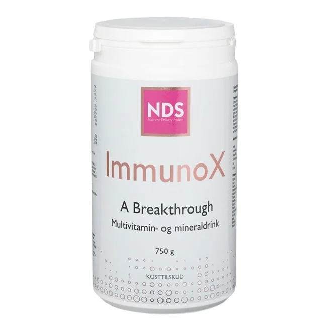 NDS® ImmunoX A Breakthrough består av vitaminer og mineraler i pulverform med appelsinsmak. Løses opp i væske og drikkes en gang om dagen.