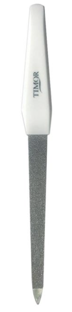 Med et blad i krombelagt stål og et hvitt plasthåndtak med neglebåndformer. Lengde 15 cm.