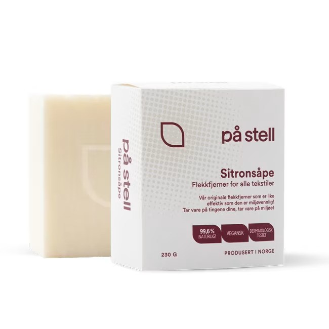 På Stell flekkfjerner må du simpelthen ha i huset! Sitronsåpen er en effektiv og naturlig løsning mot alle typer flekker – fra babygulp, urin, og grønske til bær, blod, fett, tomat og mye mer. Gi Sitronsåpen god tid til å virke ordentlig, og du vil se at til og med gamle og vanskelige flekker forsvinner helt, uten å skade tekstilene. Såpen er vegansk og har mild og behagelig duft av sitron. Den er trygg å bruke på alle tekstiler, selv ull, og er laget av naturlige oljer fra sitron, raps, solsikke og kokos, samt plantebasert glyserin. Den er derfor fri for palmeolje, skadelige kjemikalier og syntetisk parfyme. Sitronsåpen er dessuten dermatologisk testet selv mot den mest sensitive hud. Den er derfor ikke bare skånsom for miljøet, men også for huden.