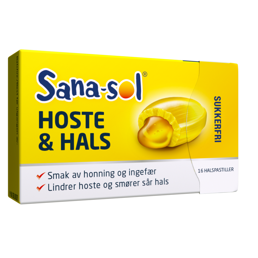 Sana-Sol Hoste & Hals 16 stk er sukkerfrie halspastiller med en myk kjerne og smak av honning og ingefær. De er utviklet for å lindre hoste, berolige tørr og sår hals, og støtte immunforsvaret.