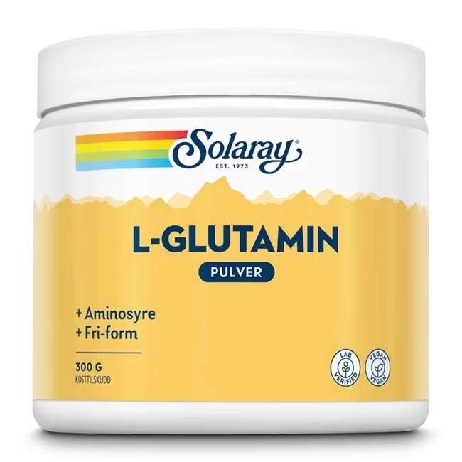 Solaray benytter L‑glutamin fremstilt ved mikrobiologisk gjæring for optimalt opptak og biologisk tilgjengelighet. Pulverformen er nøytral i smak og enkel å blande i vann.