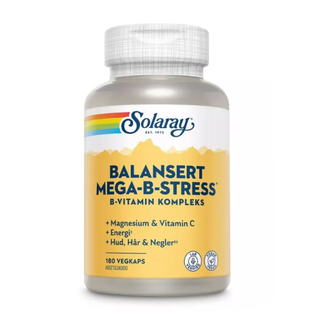 Solaray Mega B Stress Veg 180 kapsler er et komplett og balansert B‑vitamintilskudd designet for å gi kroppen ekstra støtte i perioder med stress, høyt tempo og økt belastning. B‑vitaminene fungerer som viktige kofaktorer i en lang rekke enzymatiske prosesser i kroppen, og de spiller en betydelig rolle i energiomsetning, hormonsyntese, nervesystemets funksjon og hudens helse.