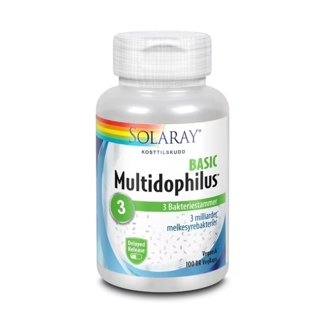 Solaray Multidophilus Basic er et mildt og balansert probiotisk tilskudd som inneholder 3 milliarder levende melkesyrebakterier fra tre dokumenterte bakteriestammer. Produktet er utviklet for daglig bruk og passer for både voksne og barn som ønsker å støtte en normal og velfungerende tarmflora.