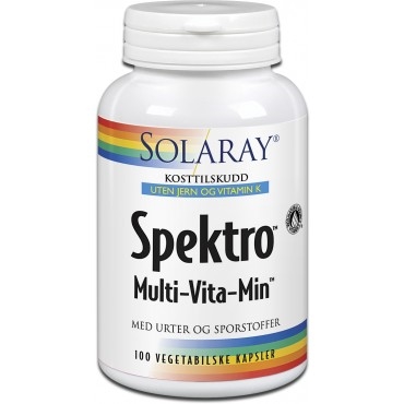 Solaray Spektro u/jern er et komplett multivitamin og mineraltilskudd med urter og sporstoffer fra naturlige kilder. Spektro u/jern er sammensatt ut fra kroppens biologiske behov. Et komplett og balansert multitilskudd av essensielle vitaminer, mineraler, urter og sporstoffer som gir næring til alle kroppens funksjoner