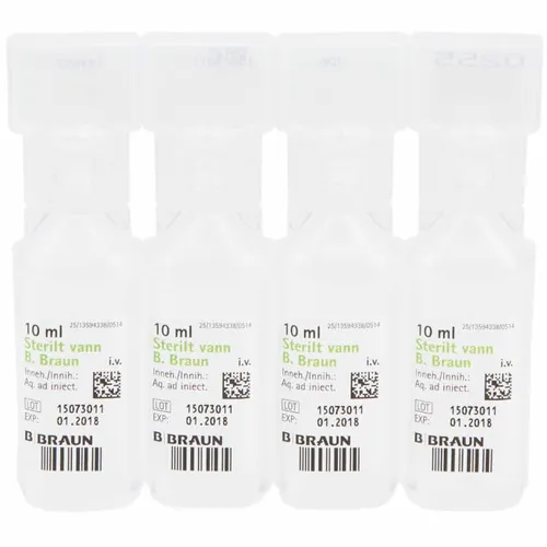 Sterilt vann oppløsningsvæske til pareneralt bruk. Leveres I plastampulle Mini-Plasco connect 20 x 10 ml.