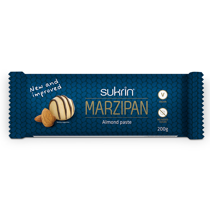SukrinMarzipan med ny og forbedret oppskrift. Innholdet av mandler har økt fra 40 til 45 %, noe som gir en enda bedre smak og lavere innhold av karbohydrater.