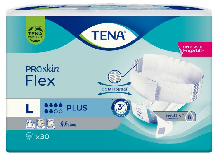 TENA Flex Plus Beltebleie L (30 stk) er et brukervennlig inkontinensprodukt som kombinerer høy absorbering med god komfort og fleksibilitet. Beltebleien er spesielt utviklet for personer med moderat til kraftig urinlekkasje, og passer godt både til dag‑ og nattbruk.
