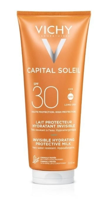Vichy Capital Soleil Invisible Hydrating Milk SPF30 er en lett og usynlig solmelk som gir bredspektret UVA/UVB‑beskyttelse uten hvite merker. Den silkemyke konsistensen absorberes raskt og etterlater huden komfortabel, myk og godt fuktet – perfekt for både hverdag og ferie.