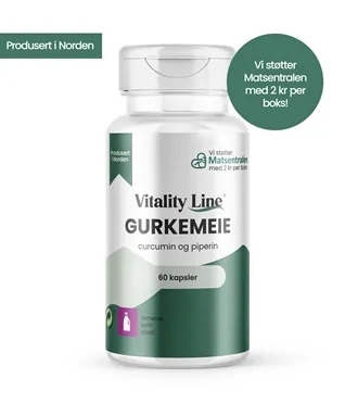 Vitality Line gurkemeie inneholder curcumin som er kjent for å virke lindrende på ømme muskler og ledd. Curcumin fungerer som en kraftig antioksidant og kan bidra til å redusere betennelse i kroppen. Piperin fra sort pepperekstrakt skal kunne bidra til å øke kroppens opptak av virkestoffet curcumin.
